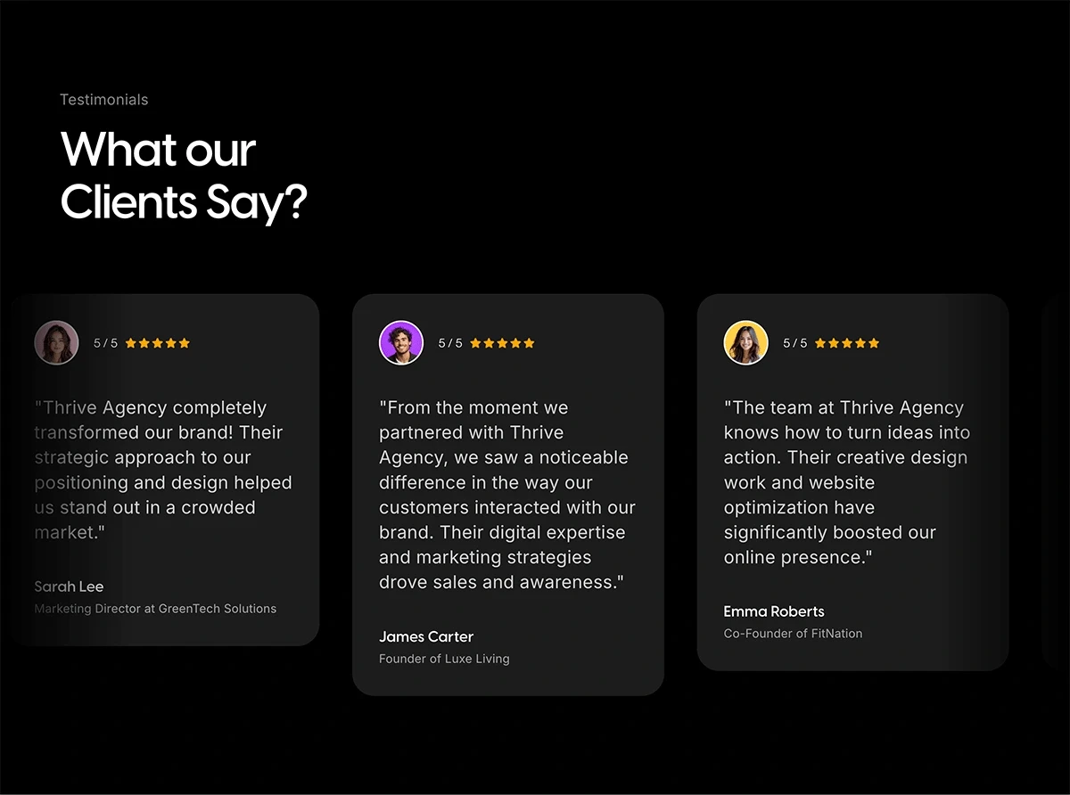 Thrive Agency is a high-impact Framer template designed specifically for modern branding and marketing agencies. The objective of this personal project was to create a highly flexible, premium digital product that helps other agencies position themselves as confident, results-driven partners. Unlike a standard client website, a template must be perfectly structured, easily adaptable, and built to handle various business needs. The goal was to balance bold visual storytelling with clear user journeys that drive meaningful inquiries and consultations.